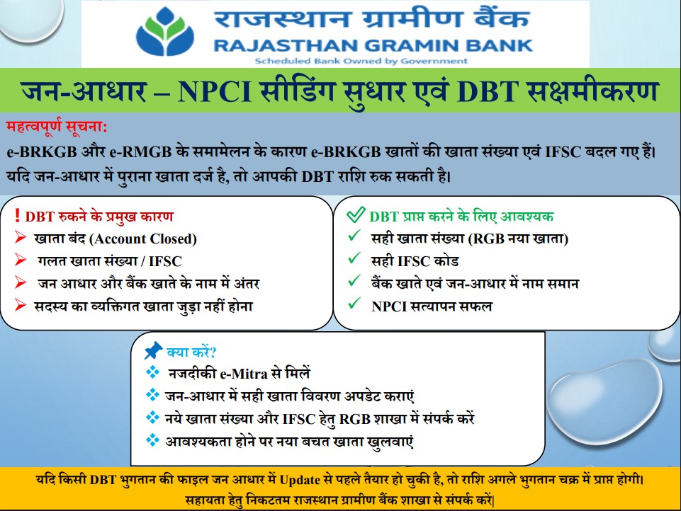 Our Internet Banking URL has been updated in accordance with RBI guidelines. The new domain .bank.in enhances security and aligns with regulatory standards. | यदि राजस्थान ग्रामीण बैंक के नए IFSC कोड को किसी पोर्टल पर स्वीकार नहीं किया जा रहा है, तो ग्राहक अस्थायी रूप से केंद्रीय IFSC कोड RMGB0000901 का उपयोग कर सकते हैं, जब तक कि संबंधित पोर्टल या विभाग में नया IFSC कोड अपडेट नहीं हो जाता। | प्रिय ग्राहक, e-BRKGB के तकनीकी माइग्रेशन के उपरांत अब आप अपने पंजीकृत मोबाइल नंबर से ONRF <पुराना A/c No> लिखकर 9257044793 पर SMS भेजकर नया राजस्थान ग्रामीण बैंक खाता नंबर प्राप्त कर सकते हैं। e.g. : यदि आपका पुराना खाता संख्या 40000100001111 है तो ONRF 40000100001111 लिखकर 9257044793 पर भेजें एवं नया राजस्थान ग्रामीण बैंक खाता नंबर पायें । साथ ही, RGB WhatsApp बैंकिंग नंबर 8750187504 पर अपने पंजीकृत मोबाइल से Hi भेजकर एवं तत्पश्चात पुराना A/c No दर्ज कर भी नया खाता विवरण प्राप्त कर सकते हैं। आपके सहयोग हेतु धन्यवाद– राजस्थान ग्रामीण बैंक